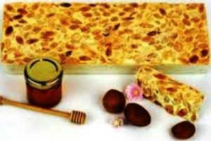 il est composé d’une pâte à base de miel, de sucre, de blanc d’œuf et d’amandes mondées entières torréfiées, traditionnellement enfermée entre deux feuilles azymes,