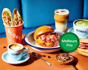 Blondie propose aussi une offre de restauration salée et sucrée, avec quelques sandwichs et des salades de saison, mais aussi des tartes, cakes, cookies, etc., le tout fait maison.