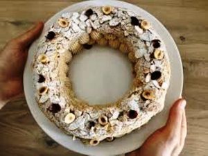 Différent d’un Paris-Brest classique, l’entremets Stohrer se présente sans pâte à chou sur le dessus, et la pâte du dessous est joliment colorée. La crème est pochée, il y a du praliné pur et des noisettes sur le dessus qu’on aperçoit au premier coup d’œil.