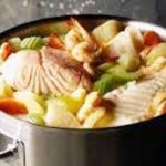 Les ingrédients de la recette sont : tranche d’espadon, tranche de cabillaud, tranche de daurade sébaste, pommes de terre, navets, carottes, poireau, branche de céleri, bouquet garni, bouquet de persil frisé, fumet de poissons, eau, huile d’olive, sel, poivre…