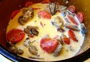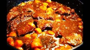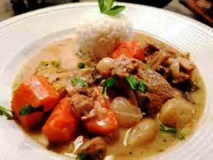 Les ingrédients de cette recette sont : cube de bouillon de bœuf, carottes, pommes de terre, champignons, bœuf, poivron, feuilles de laurier, oignon, gousse d’ail, céleri, curry, cumin, sel, poivre…