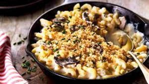 Les ingrédients de la recette sont : macaroni, crème fraîche, cheddar râpé, tranches de magret fumé, curry, farine, sel, poivre…