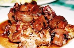 Les ingrédients de la recette sont : blanc de poulet, oignons émincés, champignons émincés, carottes, gousses d’ail hachées, farine, vin rouge, bouillon de boeuf dégraissé, bouquet garni (thym, laurier), huile d’olive, lardons, sel, poivre…