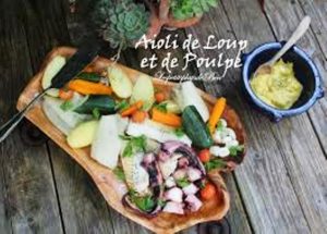 Pour la sauce : pomme de terre roseval cuite, jaunes d’œufs, gousses d’ail frais, moutarde, huile de pépins de raisin…