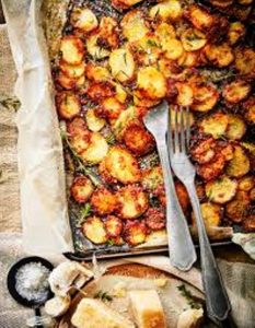 Les divers ingrédients utilisés pour réussir la recette sont : pommes de terre princesse Amandine®, gousses d’ail, beurre, parmesan râpé, fleur de sel, bouquet de thym…