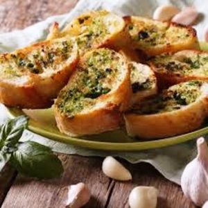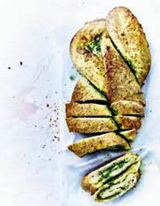 Les divers ingrédients utilisés pour réussir la recette sont : baguette précuite, petit bouquet de persil, gousses d’ail, beurre salé…