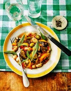 Les divers ingrédients utilisés pour réussir la recette sont : haricots blancs, aubergines, oignons, tomates, poivron jaune, poivron vert, huile d’olive, cassonade, olives vertes, câpres, gousses d’ail, bouquet de sauge, jus de citron…