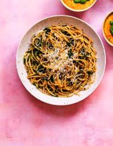 Les divers ingrédients utilisés pour réussir la recette sont : spaghetti, gousses d’ail, flocons de piment peperoncini, huile d’olive, bouquet de persil plat, parmesan…