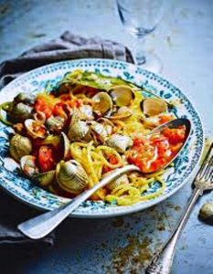 Les divers ingrédients utilisés pour réussir la recette sont : spaghettis, coques, gousses d’ail, persil plat ciselé, huile d’olive crétoise, sel, poivre…