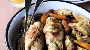 Les ingrédients nécessaires à la réalisation de cette recette sont : escalopes de veau, artichauts violets (poivrade), botte carottes primeur, échalotes, olives noires, graines de cumin…