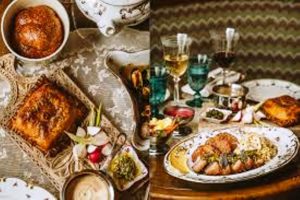 Cornichons aigres-doux, carpe farcie, caviar d’aubergines, foie haché, harengs marinés, pied-de-veau en gelée, « pikl fleysh », gâteau au fromage blanc, roulés au pavot…