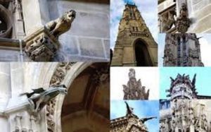Les symboles sculptés des quatre évangélistes (le lion, le taureau, l’aigle et l’homme), apparaissent dans les angles. Ces statues ont été restaurées au siècle dernier, à l’instar des gargouilles et des dix-huit statues de saints qui décorent les parois de la tour.