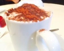 Je m’installe à une table pour déguster une formule : « instant gourmand » soit un cappuccino et un gâteau : macaronade mangue, 8 €.