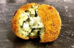 Les ingrédients utilisés pour réaliser cette recette sont : talon de jambon cuit coupé en cubes, boule de mozzarella, oignon, œuf, riz arborio, chapelure maison, vin blanc, bouillon, marjolaine séchée, safran, huile pour friture, sel, poivre…