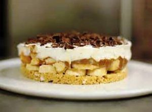 Le banoffee pie est une pâtisserie anglaise composée d’une base de crumble de biscuits secs, de banane, de confiture de lait et une généreuse couche de crème chantilly. Il existe aussi des variantes avec du chocolat, du café ou les deux. Le nom de ce dessert est un mot-valise combinant banana et toffee.