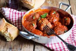Pour les boulettes : viande de veau hachée, viande de bœuf hachée, chair à saucisse, oignon jaune, câpres, tranches de pain de mie sans croûte, lait, origan séché, grana padano aop, sel, poivre…