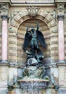 La fontaine Saint-Michel raconte donc un passage de la Bible : celui où l’Archange Saint-Michel terrasse Satan, représenté par un dragon. C’est sur 26 mètres de haut et 15 mètres de large que Davioud, aidé par Flament, Simonet et Halo, illustre cette histoire. On y voit donc un Saint Michel triomphant, main levée vers le ciel et foulant à ses pieds un horrible dragon. En contrebas de la fontaine, deux chimères crachent de l’eau.