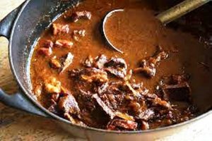 Les ingrédients utilisés pour réaliser la recette sont : bœuf (gîte ou paleron), poitrine fumée, bière brune, oignons, tranches de pain d’épice, sucre cassonade, farine, fond de veau en poudre, moutarde, huile, beurre, sel, poivre…