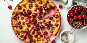 Les ingrédients utilisés pour réaliser la recette sont : cerises noires type burlat, œufs, farine, sucre en poudre, sucre glace, crème liquide, lait, rhum ou de kirsch, beurre…