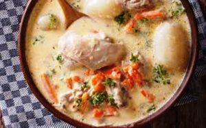 Les ingrédients utilisés pour réaliser la recette sont : poulet fermier, grosses carottes, gros poireau, cœur de céleri, jaunes d’œufs, crème épaisse, tablettes de bouillon de poule, beurre, botte de persil plat, sel, poivre…