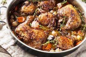 Les ingrédients utilisés pour réaliser la recette sont : coq coupé en morceaux, champignons de Paris, carotte, branche de céleri, blanc de poireau, oignon, gousses d’ail, gros lardons fumés, vin rouge corsé (type côtes-du Rhône), huile d’olive, tablettes de bouillon de volaille, brin de thym, feuille de laurier, farine, beurre, tranches de pain de mie, sel, poivre…