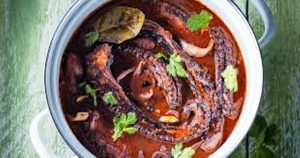Les divers ingrédients utilisés pour réussir la recette sont : poulpe, tomates pelées, oignons, gingembre frais, gousses d’ail, curcuma, 4 épices, clous de girofle, vin rouge, huile d’olive, brins de coriandre, sel, poivre…