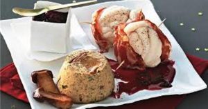 Pour un plat de fête élégant et original, essayez cette recette qui associe les saveurs de la terre et de la mer ! Les médaillons de lotte sont mis à l’honneur, enveloppés dans des tranches de coppa, rôtis au four puis accompagnés de flans de cèpes et d’une sauce au vin rouge et aux échalotes.