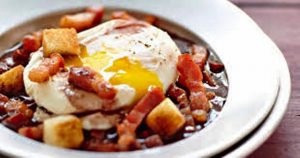Réalisez cette recette de bistrot emblématique de la gastronomie française pour une entrée de fête, à l’occasion de Pâques par exemple. Les oeufs pochés au coeur coulant sont servies avec une sauce à base de vin rouge, lardons, oignon, échalote, carotte et céleri puis accompagnés de croûtons de pain croustillants.