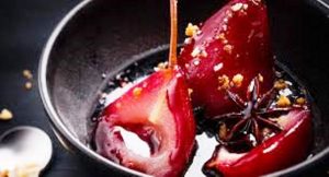 Pour la garniture : poires, rioja rouge, écorce d’orange et de citron, cannelle, clou de girofle, sucre, crème de cassis, poivre…