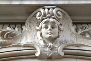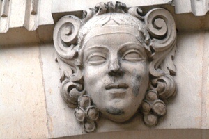 Une tête de femme orne le portail du 18 rue Soufflot 75005