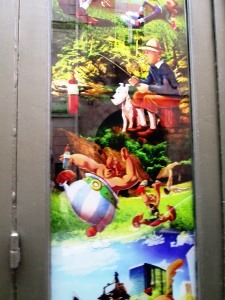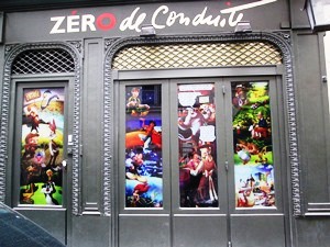 La devanture du bar Zéro de Conduite au 14 rue Jacob 75006 des vitres richement décorées de personnages de dessins animés