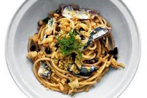 Les divers ingrédients utilisés pour réussir la recette sont : spaghetti, huile, zeste d’un citron, oignon, gousse d’ail, petit piment rouge, raisins secs, haricots verts, sardines en boite, persil frais, finement coupé…