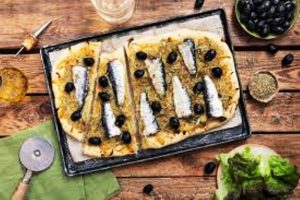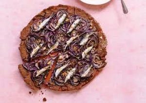 Les divers ingrédients utilisés pour réussir la recette sont : farine de sarrasin, farine de blé, huile d’olive, oignons rouges, gousse d’ail hachée, brins de thym effeuillés, sardines coupées en filets…