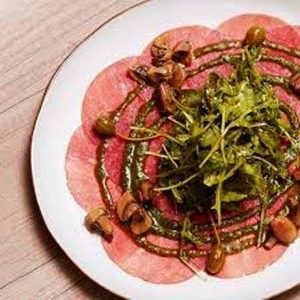 Carpaccio de bœuf poêlé champignons et haricots verts 17€