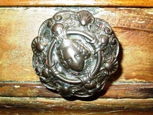 Un bouton de porte en bronze  sculpté légèrement de travers, représentant une tête de femme au 15 rue des Canettes 75006