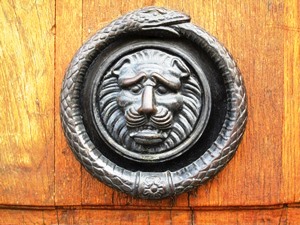 Un bouton de porte représentant une tête de lion entouré d’un serpent au  36 quai de Béthune 75004