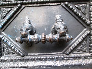 Des têtes de lions forment la poignée du 143 rue Saint Martin 75004