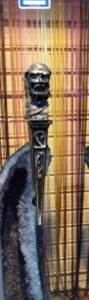Un heurtoir de porte en forme de tête de roi tenant un anneau dans sa bouche  au Musée d’art et d’histoire du Judaïsme