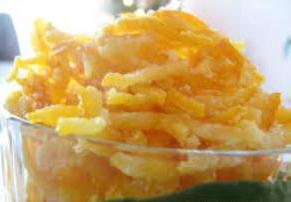 Elles sont faites de pelures d’oranges locales cuites dans de l’eau sucrée. On les fait sécher pour les décorer.