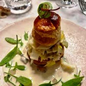 Plein de petites surprises viennent parfaire ce dîner. N’oublions pas le dessert signature, le Paris-Carcassonne qui est un Paris-Brest revisité avec un coulis au praliné et une crème plus légère. Jusqu’au 15 janvier, on profite de la fameuse et délicieuse tourte des rois à la truffe, canard et foie gras à partager en entrée, accompagnée d’une gelée au porto et de pickles.