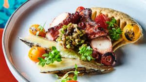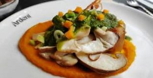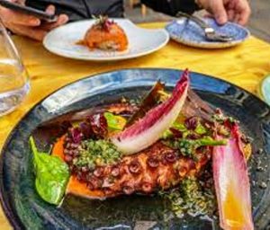 Mais aussi quelques plats « à la carte » où il assume son fort penchant pour les légumes de saison. Les papilles voyageant au gré de ses inspirations, on découvre, notamment, en entrée, un Poulpe grillé purée de pomme de terre, sauce aïoli, poudre d’épinard ou encore des radis saupoudrés de poutargue d’Afrique à la sauce salicorne.
