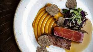 Au programme une salade de mâche et oreilles de cochon, la brouillade d’œufs, truffes noires et parmesan, le cabillaud cuit vapeur et betteraves multicolores, le canard entier de la maison Burgaud, pommes Grenaille et jus de viande, à partager à deux, la tarte aux pommes et crème double, le gâteau au chocolat…