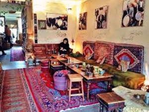 On s’installe sur les banquettes, confortablement appuyé contre des coussins brodés de motifs perses. Ici tout le mobilier vient d’Iran, depuis les tabourets en bois ouvragés, jusqu’aux tables en fer forgé, et bien sûr les tapis persans.