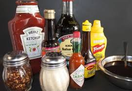 Exemples de condiments : vinaigre, huile, moutarde, mayonnaise, sauce soja, sauce pimentée, sel, cornichons, câpres, pickles, chutney, olives…