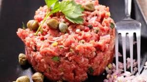 9- Le steak tartare ou tartare est une recette à base de viande de bœuf ou de viande de cheval crue, généralement hachée gros, ou coupée en petits cubes au couteau (d’où l’appellation de « tartare au couteau »). La recette actuelle figure dans Le Guide culinaire d’Auguste Escoffier de 1903 sous le nom de « beefsteak à l’américaine».