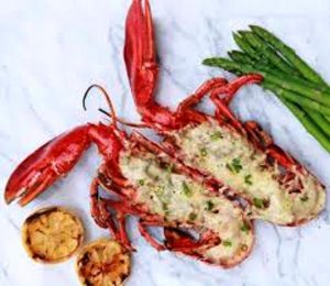 Le homard thermidor est un plat français composé de dés de chair de homard farcis dans une carapace, nappés d’une sauce au vin et au beurre, saupoudrés de fromage et grillés.