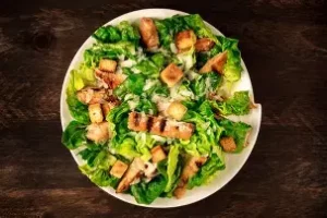 La salade César classique est composée de : feuilles de laitue romaine, croûtons à l’ail, pour apporter une dose de croustillant, des morceaux ou copeaux de parmesan, d’œuf dur ou mollet, d’anchois réduits en pâte, d’ail, de jus de citron…