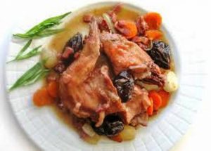 Les divers ingrédients utilisés pour réussir la recette sont : lapin coupé en morceaux, beurre, pruneaux, gelée de groseille…