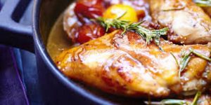 Les divers ingrédients utilisés pour réussir la recette sont : lapin coupé en morceaux, huile d’olive, échalotes, gousses d’ail, Cognac, pineau des Charentes rosé, tomates cerise, romarin, poivre du moulin…