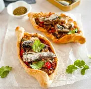 Revisitez la célèbre pizza turque avec cette recette facile et rapide de pide aux sardines. Le poisson en boite remplace ici la viande hachée de la recette traditionnelle. La pide est réalisée avec de la pâte à pizza, des légumes d’été, des herbes et des épices : un régal !